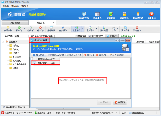 在功能導(dǎo)航窗點擊基礎(chǔ)資料—》商品信息,點擊“導(dǎo)入導(dǎo)出”按鈕下的導(dǎo)入商品資料,彈出導(dǎo)入界面。支持兩種導(dǎo)入方式,默認(rèn)導(dǎo)入方式“復(fù)制粘貼Excel記錄”如下圖所示: