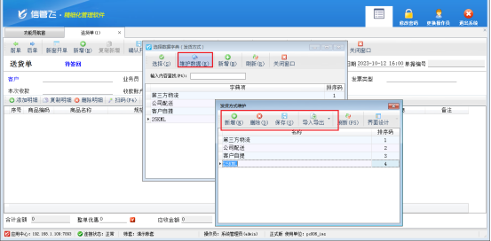 功能導航欄點擊“業務處理”-》“新開送貨單”,進入送貨單開單界面,點擊“發貨方式”后面的圖標,系統彈出“發貨方式維護”窗口,可以進行新增、刪除、導入、導出等操作,維護好之后點擊“保存”按鈕進行保存即可。