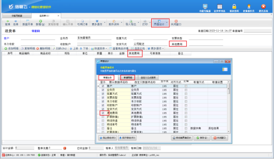 在功能導航窗點擊“業務處理”——》“新開送貨單”,打開送貨單開單界面,在界面設計中將“單據主體”及“單據明細”中“其他費用”字段配置顯示出來,如圖所示。
