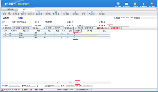 設置好之后,開送貨單時在單據明細“其他費用”中錄入相關金額,錄入完成后就可以看到單據主體其他費用中已經顯示出明細中的其他費用合計。