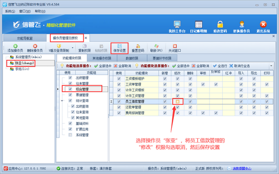 登錄軟件,在功能導航窗點擊“系統管理”—》“操作員及授權”,進入“操作員管理及授權”界面,選擇操作員“張亞”,在其右側的功能模塊權限內選擇“綜合管理”模塊,將員工借款管理的“修改”權限勾選取消,然后保存設置,如下圖所示。