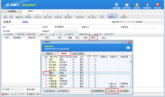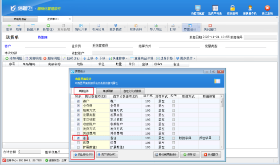 界面設計窗口中可分別對單據主體、單據明細進行設計,點擊“單據主體”,勾選需要顯示的數據項,不需要顯示的數據項可取消勾選,可以選擇上/下移動的方式與其他需要顯示的數據項移動到一起,然后點擊“保存”按鈕即可,單據明細的設置與主體類似,如下圖所示,單據主體中可以將“備注”勾選出來,單據明細中可將“稅率”取消顯示。