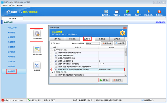 在功能導航窗點擊“系統管理”—》“系統參數配置”—》“業務參數”打開業務參數配置界面,在“業務單據相關參數”內啟用參數“銷售單保存時匯總明細數值到單據主體數據項”,并設置參數值,默認是“extnum8=extnum12”(指匯總“單據明細.擴展數值12”數值合計到“單據主體.擴展數值8”)。