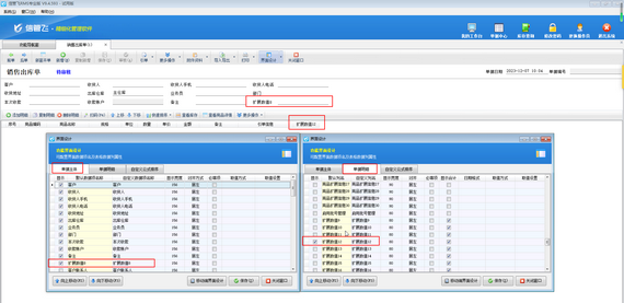 參數設置好之后,在功能導航窗點擊“銷售管理”—》“銷售出庫單”,在打開的銷售出庫單界面工具欄點擊界面設計,在界面設計內將“單據主體.擴展數值8”以及“單據明細.擴展數值12”勾選顯示出來,如下圖所示。
