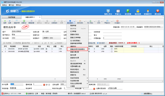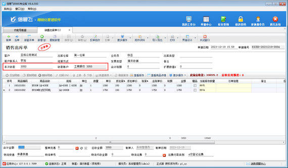 在功能導(dǎo)航窗點擊“銷售管理”—》“銷售出庫單”,打開銷售出庫單界面,新增一個銷售出庫單,并錄入本次收款金額,然后保存并審核銷售出庫單,如下圖所示: