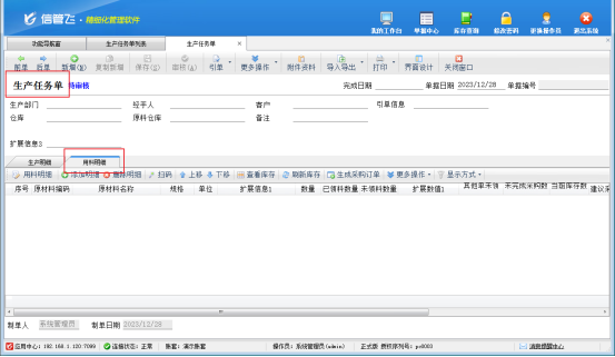 設置完成后,返回生產任務單界面,此時可以看到用料明細已顯示出來了,如圖所示: