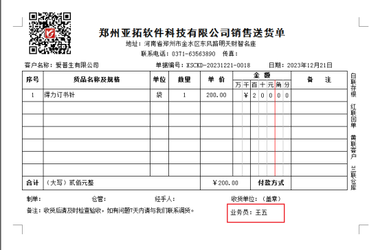 第一種情況:業務員名字固定顯示,雙擊打開添加的文本框,直接輸入內容,示例內容“業務員:王五”,之后點擊“√”確定,添加完成后預覽模板如下圖所示:
