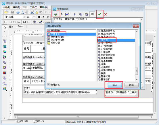 第二種情況:業務員名字調用開單界面單據主體的業務員,雙擊打開添加的文本框,先輸入內容“業務員:”,之后調用“[單據主體."業務員"]”,點擊“√”確定,設置完成后,預覽界面如下圖所示: