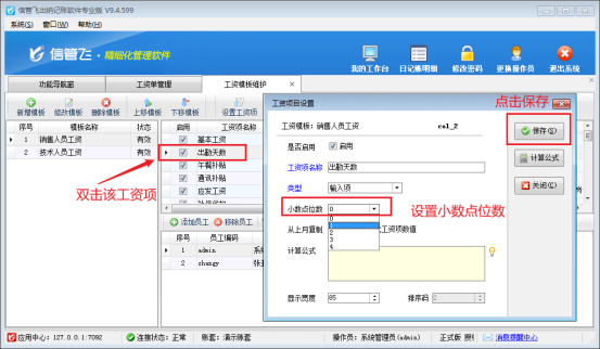 在功能導航窗點擊“綜合管理”—》“工資模板維護”,在工資模板維護界面,找到無法輸入小數位數的工資項“出勤天數”,雙擊該工資項,打開工資項目設置,設置該工資項的小數點位數,如下圖所示。