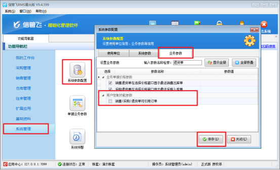 在功能導(dǎo)航窗點(diǎn)擊“系統(tǒng)管理”—》“系統(tǒng)參數(shù)配置”,進(jìn)入系統(tǒng)參數(shù)配置界面,點(diǎn)擊“業(yè)務(wù)參數(shù)”,取消勾選“銷售(采購)退貨單可引用訂單”參數(shù),點(diǎn)擊保存按鈕,如下圖所示: