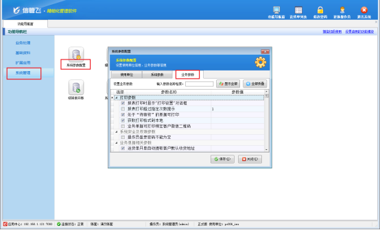在功能導(dǎo)航窗點擊“系統(tǒng)管理”—》“系統(tǒng)參數(shù)配置”,點擊“業(yè)務(wù)參數(shù)”,在業(yè)務(wù)單據(jù)相關(guān)參數(shù)中勾選啟用“商品單位換算比率小數(shù)位數(shù)”參數(shù),并設(shè)置參數(shù)值,然后點擊“保存”按鈕保存參數(shù)配置,如下圖所示,設(shè)置商品單位換算比率小數(shù)保留5位顯示。