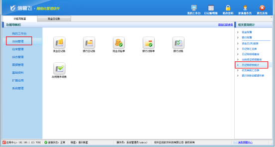 在功能導(dǎo)航窗點(diǎn)擊“出納管理”—》“現(xiàn)金日記賬”,新增日記賬憑證時(shí)需要輸入“輔助項(xiàng)目”,然后在“出納管理”模塊最右側(cè)的“相關(guān)查詢統(tǒng)計(jì)”內(nèi)點(diǎn)擊“日記賬綜合統(tǒng)計(jì)”,如圖所示。