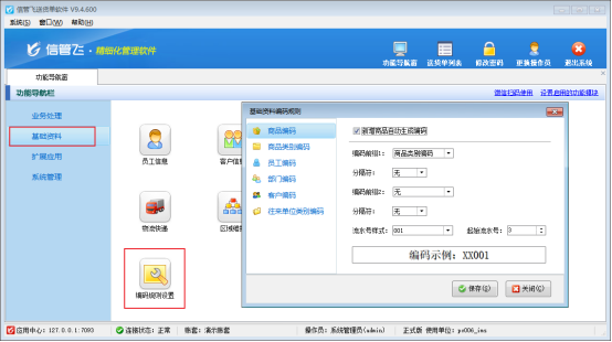 在功能導(dǎo)航窗點(diǎn)“基礎(chǔ)資料”—》“編碼規(guī)則設(shè)置”即可進(jìn)入基礎(chǔ)資料編碼規(guī)則界面,如下圖所示:
