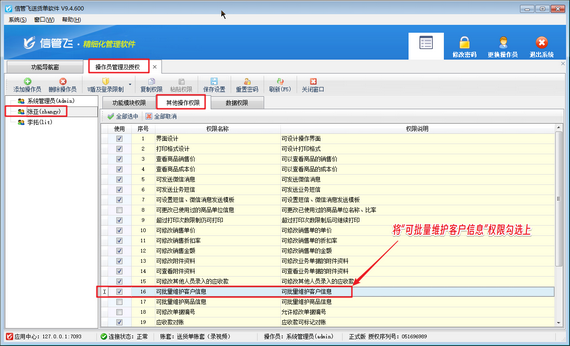 出現以上問題的原因是:操作員賬號沒有操作“批量維護客戶信息”功能的權限,解決方法如下:使用系統管理員賬號登錄軟件,在功能導航窗點擊“系統管理”—》“操作員及授權”打開操作員管理及授權界面,選擇操作員賬號,在“其他操作權限”界面將“批量維護客戶信息”權限勾選上,然后保存權限設置,如下圖所示。