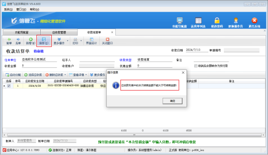 收款結算單用來登記收款信息(收款對象即客戶、收款賬戶、收款金額、經手人等),并結銷應收款記錄。正常情況下,應收金額為多少,即客戶支付我們多少貨款,但是部分情況下用戶在開單保存時出現提示信息該如何處理,本篇文章我們介紹下保存結算單提示“應收款列表中的本次結銷金額不能大于可結銷金額!”該如何解決?提示信息如下圖所示: