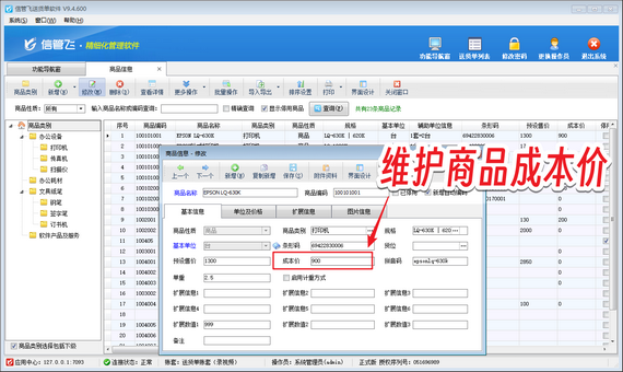 首先,信管飛送貨單軟件支持一鍵維護商品成本。只需在“基礎資料”模塊中的“商品信息”內(nèi),簡單錄入每個商品的成本價,系統(tǒng)就能為你自動保存,讓商品管理變得井井有條。這樣,無論你的商品種類多么繁雜,都能輕松應對。