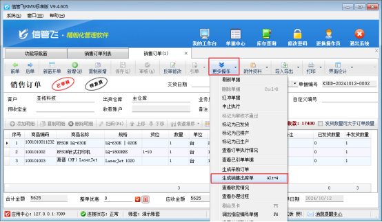 打開客戶銷售訂單,在訂單界面更多操作下---生成銷售出庫單,如下圖所示: