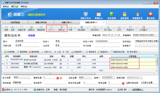 銷售出庫單界面保存審核后,相應商品庫存數量會減少,如圖所示: