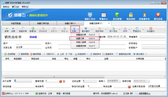 打開銷售出庫單,在出庫單界面點擊引單--引用銷售訂單,在選擇銷售訂單界面勾選需要發貨的銷售訂單,如圖所示: