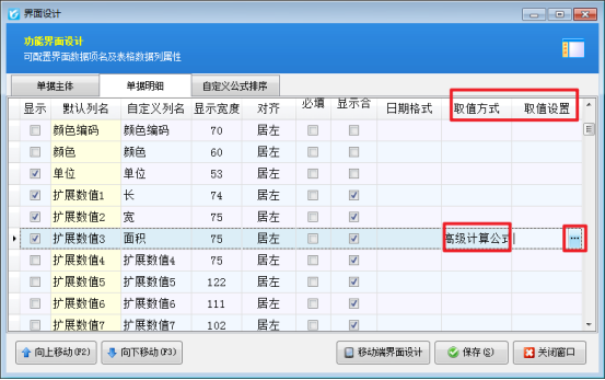 1、在單據明細標簽頁的默認列名中找到擴展數值1、擴展數值2、擴展數值3這三項,分別自定義列名為長、寬、面積。