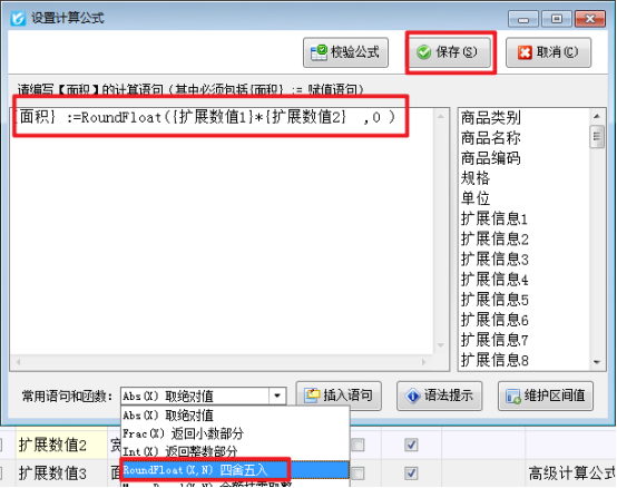 2、選擇“面積”數據項,設置取值方式為“高級計算公式”,取值設置為:{面積} :=RoundFloat({擴展數值1}*{擴展數值2}  ,0 )。