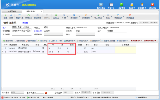 設置后保存公式,返回開單界面,輸入長和寬,面積自動四舍五入取整顯示。