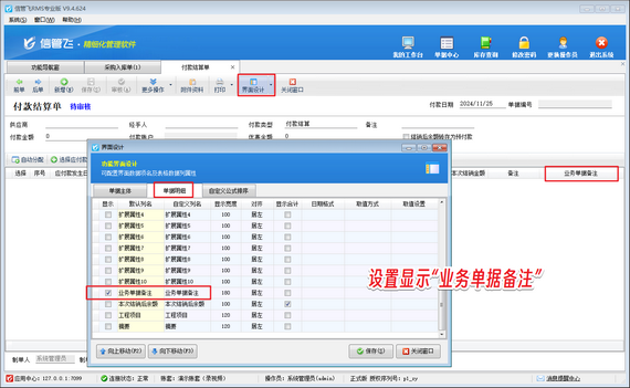 在功能導航窗點擊“往來管理”—》“付款結算單”打開付款結算單列表界面,新增付款結算單,打開付款結算單界面。然后在付款結算單界面工具欄點擊“界面設計”,在單據明細內,找到“業務單據備注”并勾選顯示出來。