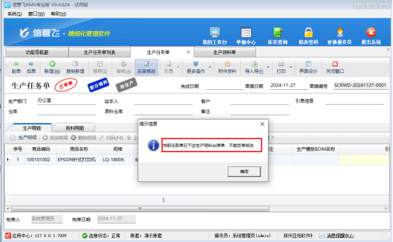 信管飛RMS軟件標準版及專業(yè)版支持擴展功能模塊。擴展生產管理模塊后,生產任務單被引用開單生產領料單,客戶咨詢領料期間發(fā)現部分庫存無貨,只能更改任務單,在更改部分領料狀態(tài)的生產任務單時提示“當前任務單已下達生產領料出庫單,不能反審修改”,如何解決?提示如下圖所示: