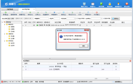 在軟件內點擊“賬務處理”—》“會計憑證”,可打開會計憑證列表界面,選中有誤憑證,單據操作下點作廢憑證,提示“會計憑證作廢失敗,單據日期不能小于當前賬期2023-04-01”,無法直接作廢,如圖: