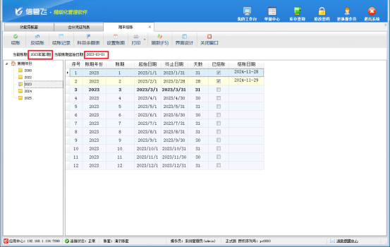 解決方法如下:功能導航欄點擊“賬務處理”—》“期末結賬”,工具欄點“反結賬”,反結賬完成后,相應賬戶回退到上一個賬期,例如提示“單據日期不能小于當前賬期2023-04-01”,就把賬期反結賬到2023年第3期,如圖: