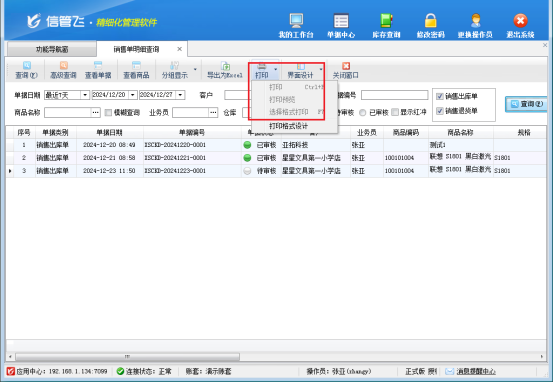 進(jìn)銷存管理軟件、信管飛倉(cāng)庫(kù)管理軟件、信管飛送貨單軟件、信管飛出納記賬軟件等軟件內(nèi)都提供的有打印預(yù)覽及打印功能,可以打印銷售單、對(duì)賬單及各類統(tǒng)計(jì)報(bào)表。然而,有用戶反映,在銷售單明細(xì)查詢界面,他們希望無需操作員手動(dòng)執(zhí)行打印操作。針對(duì)這一需求,本篇文章以“信管飛RMS軟件”為例介紹下如何解決?