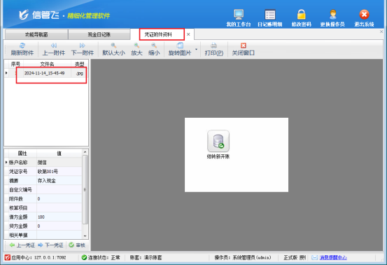 信管飛出納記賬軟件在新增或修改憑證時(shí),允許用戶添加文檔、圖表等豐富的附件資料,支持掃描或直接導(dǎo)入與出納憑證相關(guān)的電子文件。這一功能極大地方便了用戶全面、直觀地回溯和查詢?nèi)沼涃~憑證的詳細(xì)信息,有效提升了企業(yè)對日記賬憑證的管理效率。當(dāng)用戶需要在日記賬列表界面快速查看某一憑證的附件時(shí),信管飛出納記賬軟件提供了直接在列表中打開附件資料的便捷功能。本文以“信管飛出納記賬軟件”為例介紹一下如何在日記賬列表界面輕松查看憑證附件?