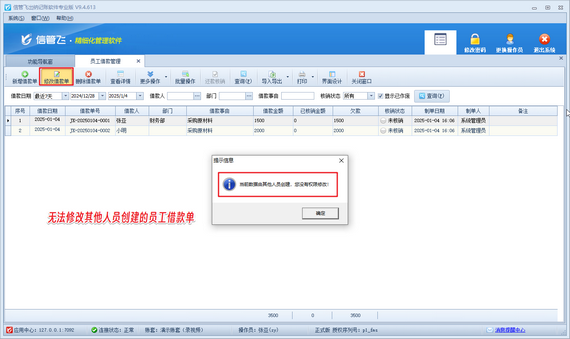 出現以上問題的原因是:當前登錄的操作員賬號沒有可修改其他人員創建的員工借款單權限。