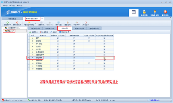 解決方法如下:使用系統管理員賬號登錄軟件,在功能導航窗點擊“系統管理”—》“操作員及授權”打開操作員管理及授權界面,選擇操作員賬號,在“數據權限”界面將員工借款“可修改有查看權限的數據”的權限勾選上,然后保存權限設置,如下圖所示。