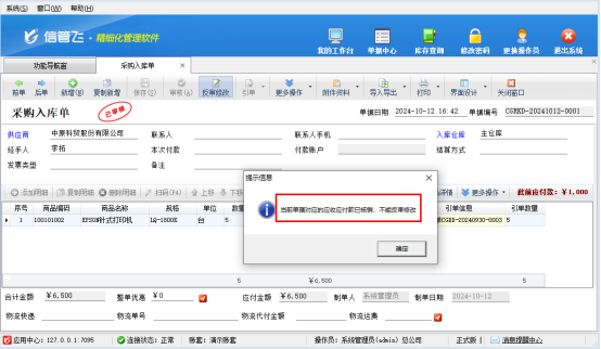 信管飛RMS軟件是集進銷存和應收應付款管理一體的軟件,有客戶咨詢需要反審修改單據的單價時修改不了,如何解決,提示如下圖所示: