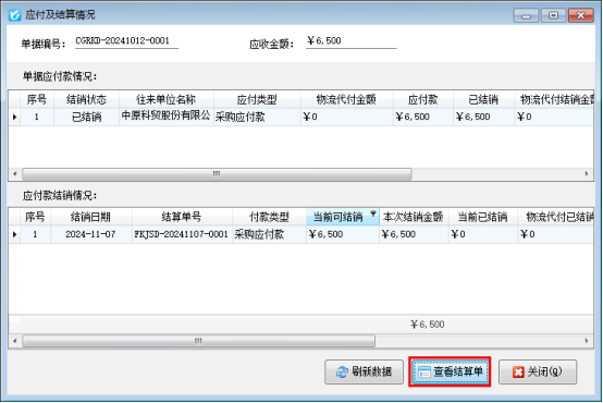 已結銷應付款的單據需要反審修改,需變為“未結銷”狀態,快捷操作方式,在采購入庫單界面點擊更多操作下的“查看應付款及結銷情況”,彈出界面點擊“查看結算單”如下圖所示:
