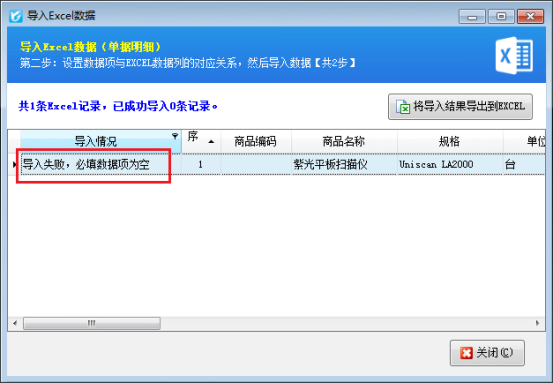 銷售單開單界面,直接導(dǎo)入EXCEL明細(xì)出現(xiàn)提示“導(dǎo)入失敗,必填數(shù)據(jù)項(xiàng)為空”,這是因?yàn)檐浖锩婺承⿺?shù)據(jù)項(xiàng)設(shè)置了必填,表格里面卻沒有數(shù)據(jù)導(dǎo)致的,如圖: