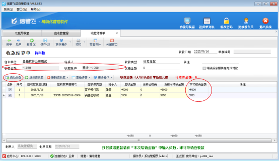 在應(yīng)收款管理界面點擊收款結(jié)算,進入收款結(jié)算單單據(jù)界面,在該界面錄入收款金額和收款賬戶,客戶預付款和銷售應(yīng)收款抵消結(jié)算,多余預付退回,收款金額輸入負1050元,點擊自動分配,如圖