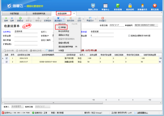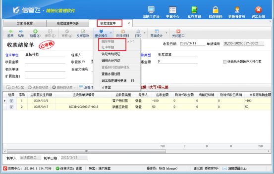 權限設置完成后,操作員重新登錄軟件,再次進入收款結算單界面,就會發現紅沖刪除按鈕已經恢復正常,可以順利完成相關操作。