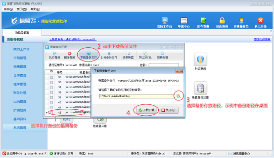 執(zhí)行備份文件后,點(diǎn)擊“下載備份文件”,選擇備份文件路徑,示例中保存?zhèn)浞菸募谧烂妫С肿约哼x擇備份路徑,點(diǎn)擊開始下載(下載進(jìn)度條到達(dá)100%提示備份完成桌面生成dbz備份文件)。