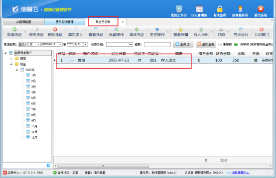 完成憑證轉記后,在功能導航窗點擊“出納管理”—》“現金/銀行日記賬”,進入日記賬界面。所有轉記的憑證信息清晰呈現,方便隨時查看、核對,實時掌握企業資金動態。
