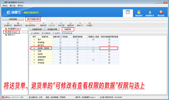 解決方法如下:使用系統管理員賬號登錄軟件,在功能導航窗點擊“系統管理”—》“操作員及授權”打開操作員管理及授權界面,選擇操作員賬號,在“數據權限”界面將送貨單、退貨單的“可修改有查看權限的數據”的權限勾選上,然后保存權限設置,如下圖所示。
