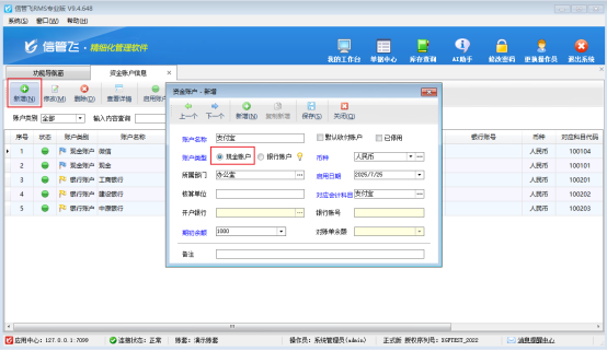 點(diǎn)擊工具欄中的“新增”按鈕,在彈出的“資金賬戶—新增”窗口錄入賬戶名稱、勾選賬戶類型“銀行賬戶”、期初余額及其他相關(guān)信息后點(diǎn)擊“保存”按鈕即可保存到系統(tǒng)內(nèi),如下圖