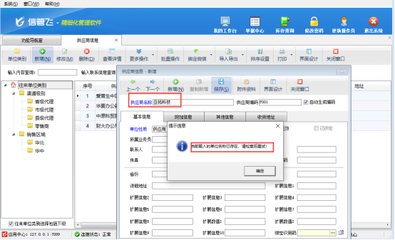 用戶新增供應(yīng)商信息保存時提示“當(dāng)前往來單位名稱已存在”無法保存,如何解決?如下圖所示: