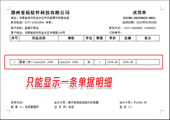最近有信管飛軟件用戶咨詢,在軟件內(nèi)自定義設(shè)計的銷售單打印格式模版,打印預(yù)覽只能顯示一條單據(jù)明細,如下圖所示。