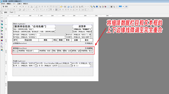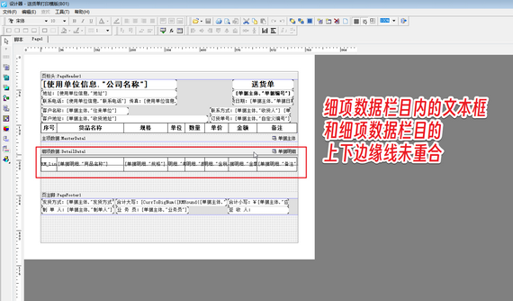 出現(xiàn)以上問題的原因是:在設(shè)計模版時,細項數(shù)據(jù)欄目內(nèi)的文本框超出了細項數(shù)據(jù)欄目區(qū)域,文本框上下邊緣線和細項數(shù)據(jù)欄目的上下邊緣線未完全重合。