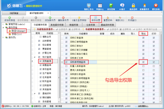 首先使用系統管理員賬號登錄軟件,在功能導航窗中,點擊“系統管理”—》“操作員及授權”,進入“操作員管理及授權”界面,在操作員列表中,選擇需要設置權限的操作員,例如“張亞”,在其右側的功能模塊權限內,找到“采購查詢”模塊,將采購單明細查詢的“導出”權限勾選,然后點擊保存按鈕保存。