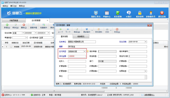 再回到應(yīng)付款管理界面,未結(jié)銷的采購(gòu)預(yù)付款的結(jié)銷狀態(tài)更新為部分結(jié)銷,并且未結(jié)銷金額是-50000元,該筆采購(gòu)預(yù)付款可用于后續(xù)采購(gòu)應(yīng)付款金額進(jìn)行抵消結(jié)算。