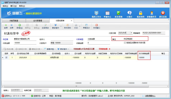 在付款結(jié)算單界面單獨(dú)結(jié)算這一筆采購(gòu)預(yù)付款的賬單,付款金額錄入-50000元,可以在備注項(xiàng)錄入供應(yīng)商退回以便后續(xù)查詢,如下圖所示: