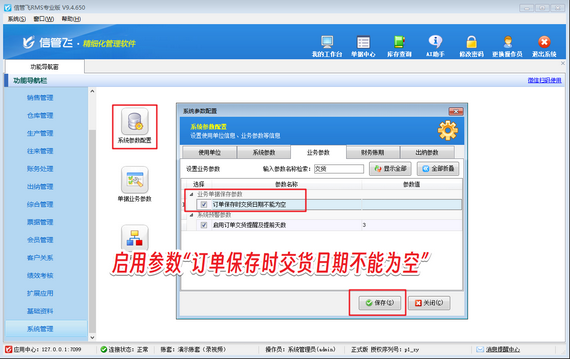 操作簡單,一鍵啟用:在功能導(dǎo)航窗點(diǎn)擊“系統(tǒng)管理”—》“系統(tǒng)參數(shù)設(shè)置”—》“業(yè)務(wù)參數(shù)”打開業(yè)務(wù)參數(shù)設(shè)置界面,在業(yè)務(wù)單據(jù)保存參數(shù)內(nèi)勾選啟用參數(shù)“訂單保存時交貨日期不能為空”,然后保存參數(shù)設(shè)置即可。